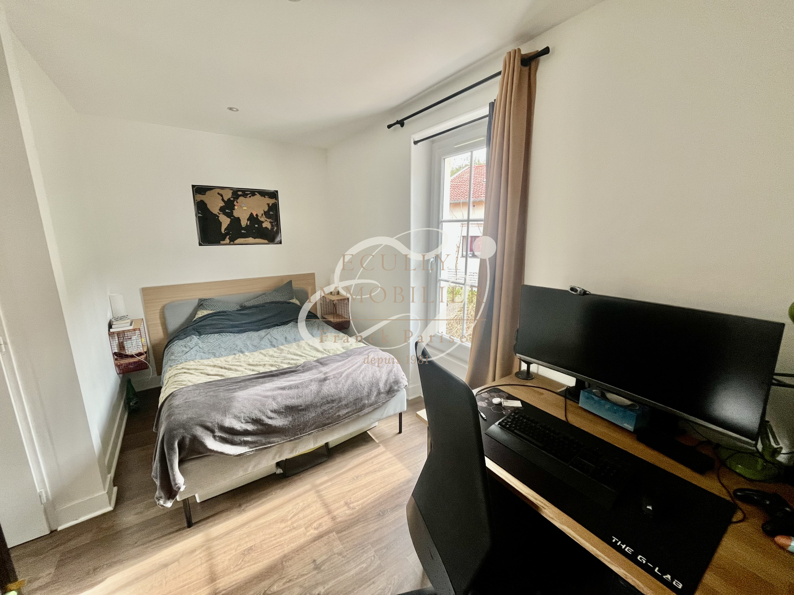 À l'étage , l'espace nuit propose une spacieuse chambre de plus de 15 m2, permettant facilement l'aménagement d'un coin bureau ou de rangements supplémentaires.