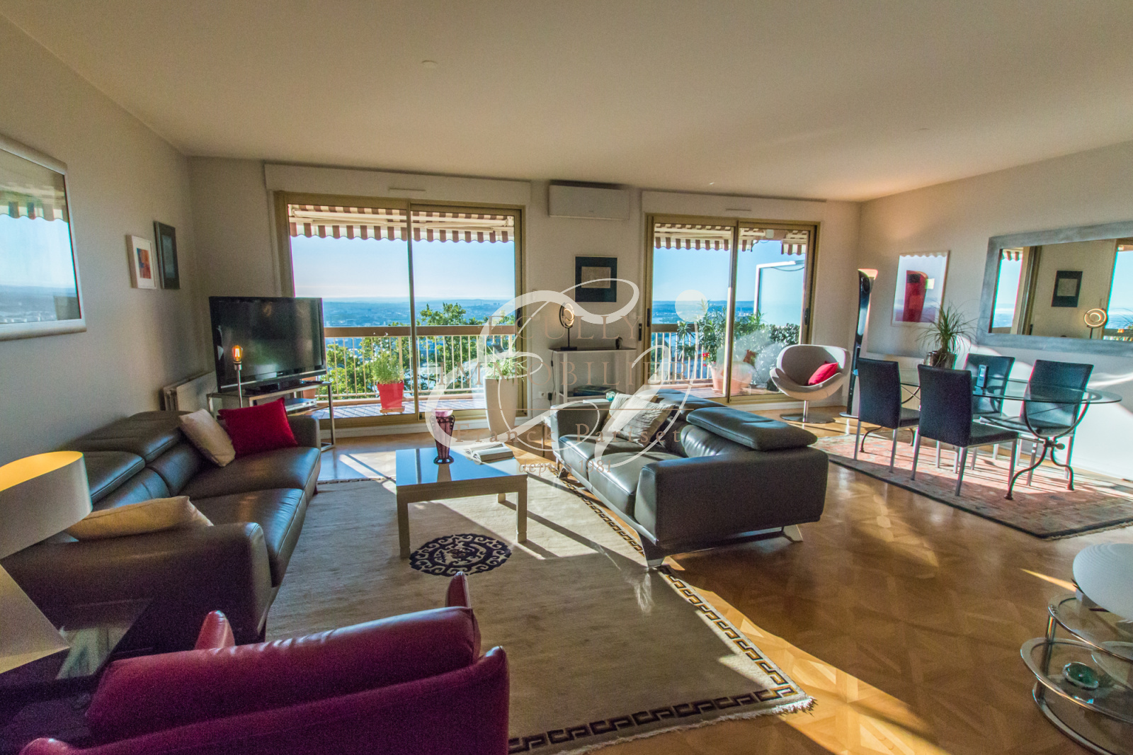 Il se compose d'une vaste entrée ouverte sur un séjour double de plus de 35 m2 donnant accès à un grand balcon et sa vue panoramique.