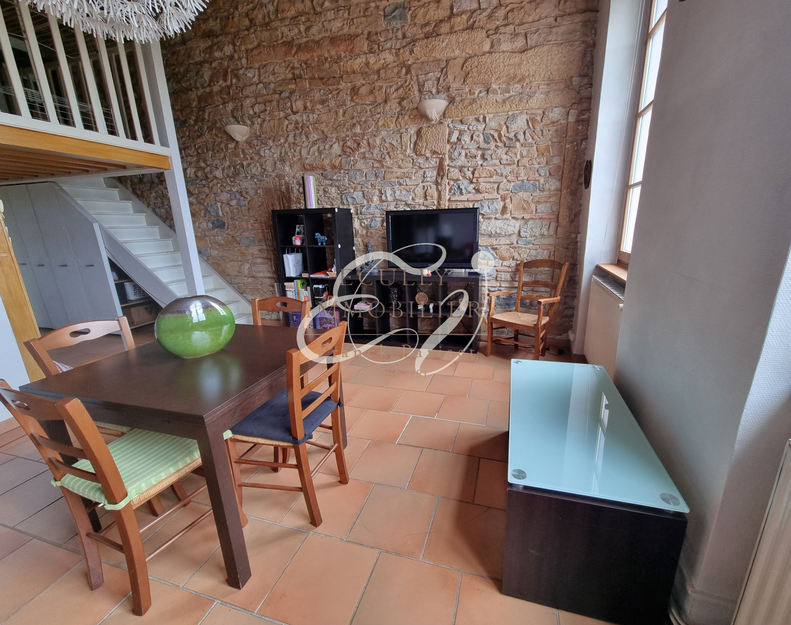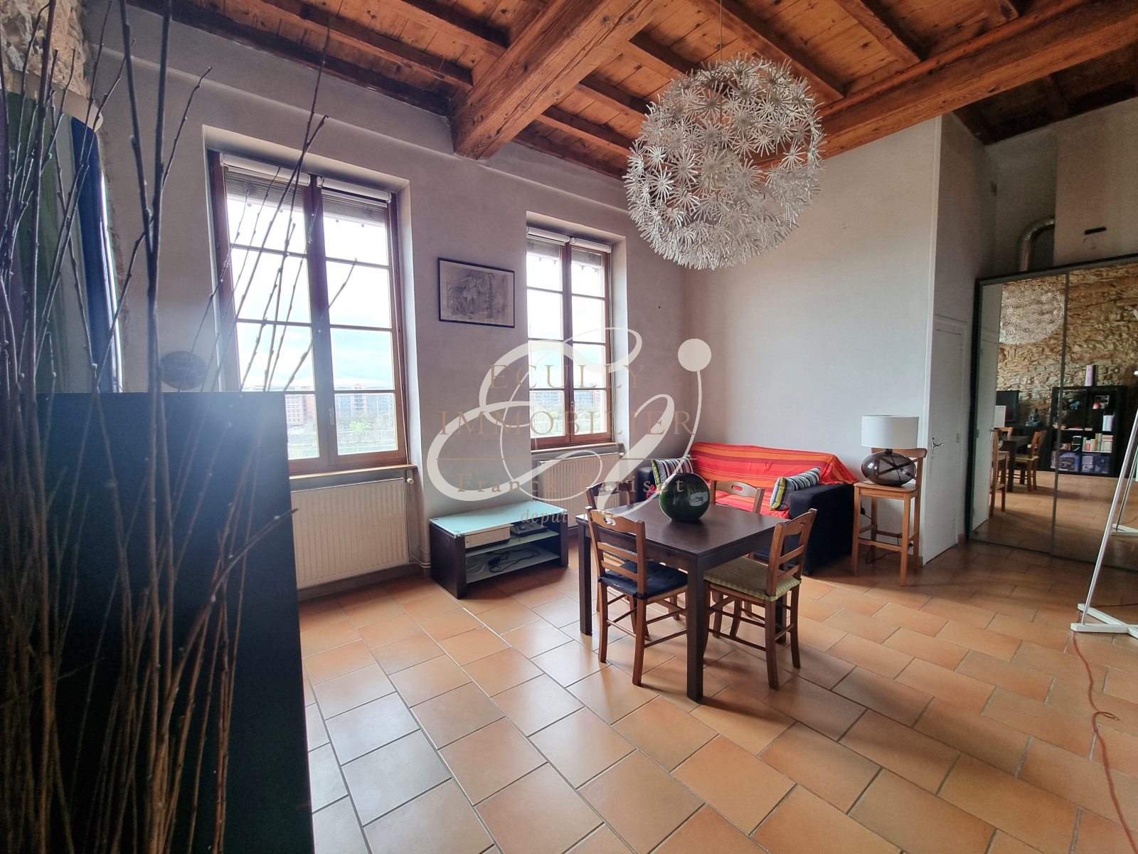 Caluire-et-Cuire (69300)VENTE CALUIRE ET CUIRE 69300 - EXCLUSIVITE - Ravissant T1 bis de type canut de 59m² habitables (40.55m² carrez) au DERNIER ETAGE (sans ascenseur) d'une copropriété ancienne sécurisée et bien entretenue face à la Passerelle de la Paix avec VUE EXCEPTIONNELLE sur le Rhône et la Cité Internationale. Du cachet (poutres / pierres apparentes - belle hauteur sous plafond) pour cet appartement lumineux composé d'une entrée avec placards, d'un séjour de 21m² avec cuisine américaine de 10.45m², d'une mezzanine (hors carrez) de plus de 14m² et d'une salle d'eau avec WC. Un GRENIER aménageable de plus de 13m² (juste au-dessus !) complète ce bien ainsi qu'une cave voûtée (à cloisonner) de 6m². Faibles charges. Possibilité d'un stationnement simple à 3mn en location (60€/mois) . Arrêt bus au pied et Parc de la Tête d'Or à 5mn, idem commerces de proximité, 10mn en voiture Part Dieu, Presqu'île et Croix Rousse, accès aisé aux grands axes. Etonnant et charmant avec du POTENTIEL, à voir ! Contact : Marie CLEMARES agent commercial 06 42 30 40 30