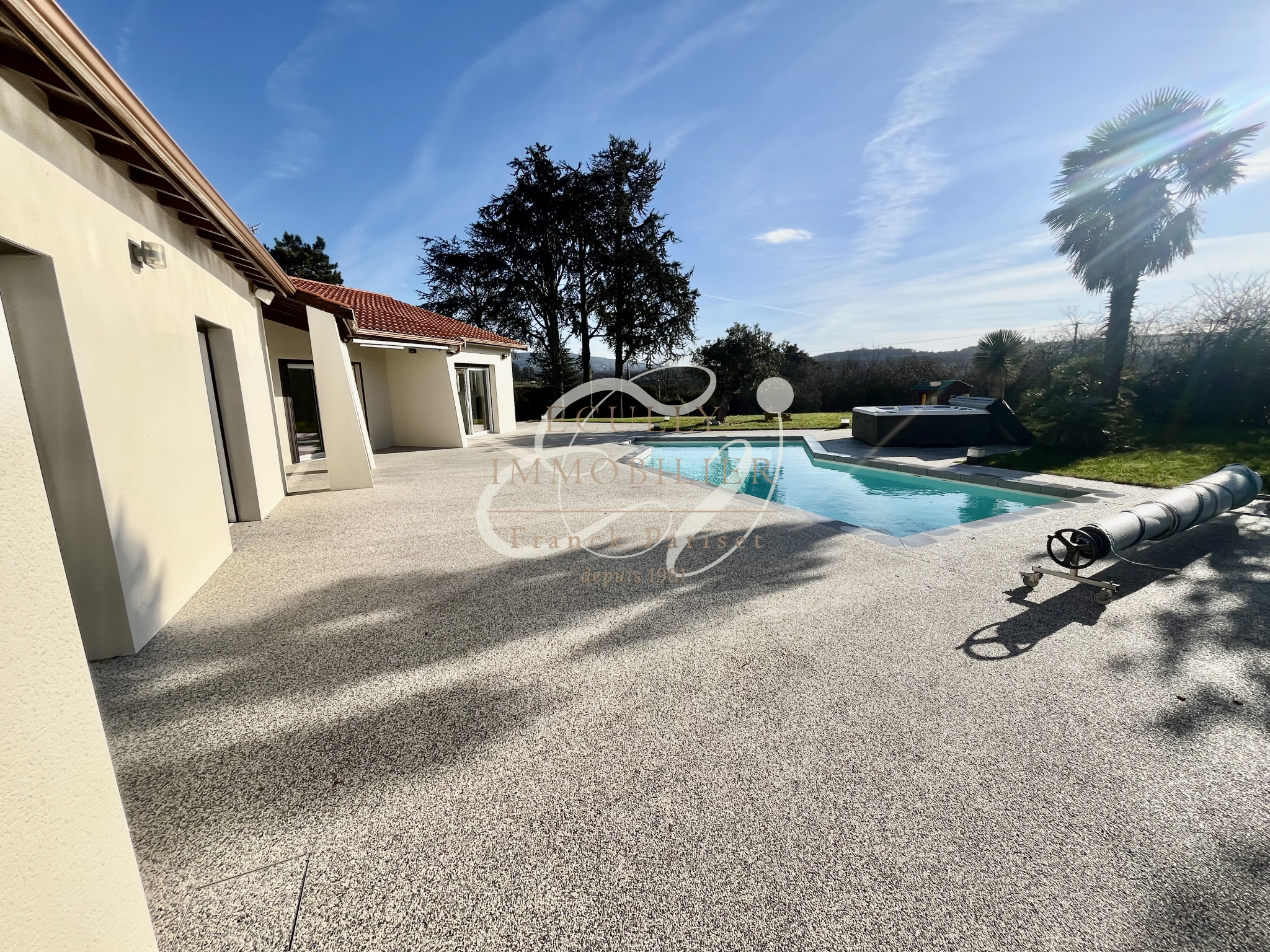 Dommartin (69380)venez découvrir cette maison de plain-pied offrant des prestations de qualité. D’une surface habitable d’environ 248 m², elle dispose également d’un garage double de 60 m², d’une piscine, d’un pool-house, d’un terrain de pétanque, le tout implanté sur une parcelle arborée d’environ 3 000 m².